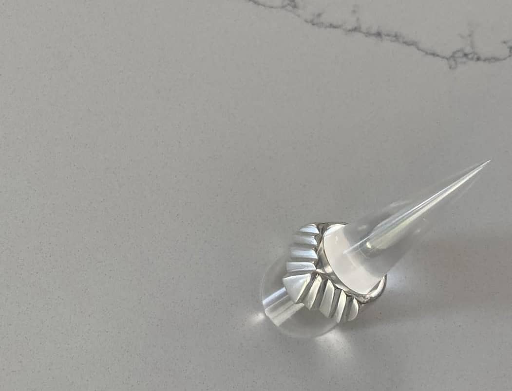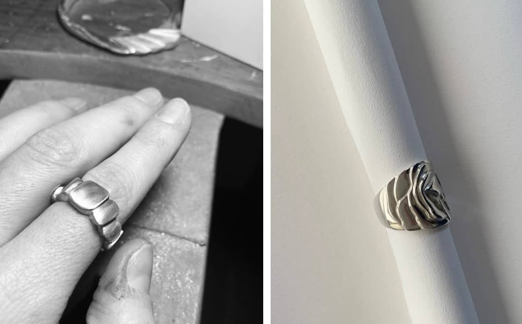 For Emmy, jewellery is much more than decoration. “It’s wearable art,” she explains, “a sculpture that’s comfortable and bold, bold enough to become part of your identity.” Her inspiration comes from nature and geometry, like the layered petals of a rose, or the rising precision of an ocean swell. With three preschoolers at home, her current process starts in her head. A little piece of everyday life will inspire her, followed by dreaming and sketching in her head, so when she gets time to create at the bench, her designs are already fully formed.