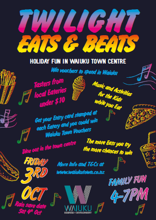 🎶 Waiuku Eats & Beats Waiuku Town Centre, 4–7pm Live music, kids entertainment, and $10-or-less meals from local eateries. Thanks Waiuku!