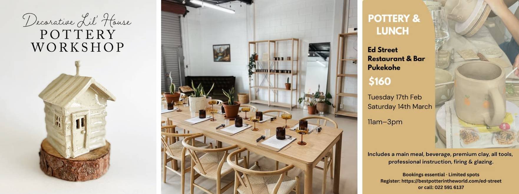 Tue 17 Feb, Sat 14 Mar 🍽️🏺 Pottery & Lunch (Pukekohe) Ed Street, 27 Edinburgh Street • 11:00am–3:00pm Relaxed adult pottery workshop with Madison North Cowper + a beverage + a meal. Includes materials, firing + glazing. $160 - tickets here!